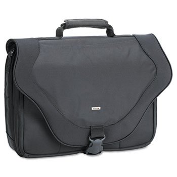 Main padded compartment holds laptops. Shoulder strap features non-slip pad and is adjustable and removable. Adjustable speed buckle keeps front flap secure. Includes organizer and accessory pockets under front flap. Ride Along pocket attaches to rolling bags for consolidated travel. For Device Type: Notebook; Material(s): PolyTwist; Carrying Method: Carrying Handle; Shoulder Strap; Color(s): Black.
