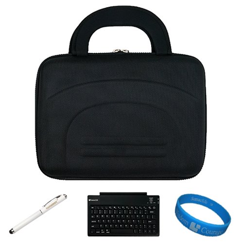 Safely carry your 10-inch tablet with this hard shell cube carrying case. This case is made for to just-fit the 10" tablet inside the case(tablet NOT included).Provides maximum protection against unnecessary scratches and scuffs.Non-Scratch Microfiber interior compliments your device with a soft-smooth texture. Dual rubber zipper for added convenience. Elastic Velcro restraint strap prevents your device from falling out of the case when case is opened. Interior fishnet pocket for storage of accessories such as CD, USB cable, pen and paper// INCLUDES!!! SD Memory Card Slots. Case Interior Dimension: 10.5 x 7.5 x 1. INCLUDES!!! White - Executive Laser Stylus Pen. 3 in 1: Stylus Point to navigate on Resistive Screens, White LED light and Red Laser Pointer.Package also includes a completely cable-free Wireless Keyboard uses Bluetooth technology to connect with your device. So you're free to move the keyboard just about anywhere within range and wirelessly type away. It's a 49 Key Input Keyboard with micro USB charging, built in rechargeable Li-ion battery and a color LED for working status indication. INCLUDES!!! SumacLife TM Wisdom Courage Wristband