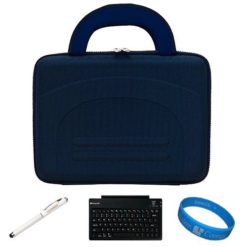 Safely carry your 10-inch tablet with this hard shell cube carrying case. This case is made for to just-fit the 10" tablet inside the case(tablet NOT included).Provides maximum protection against unnecessary scratches and scuffs.Non-Scratch Microfiber interior compliments your device with a soft-smooth texture. Dual rubber zipper for added convenience. Elastic Velcro restraint strap prevents your device from falling out of the case when case is opened. Interior fishnet pocket for storage of accessories such as CD, USB cable, pen and paper// INCLUDES!!! SD Memory Card Slots. Case Interior Dimension: 10.5 x 7.5 x 1. INCLUDES!!! White - Executive Laser Stylus Pen. 3 in 1: Stylus Point to navigate on Resistive Screens, White LED light and Red Laser Pointer.Package also includes a completely cable-free Wireless Keyboard uses Bluetooth technology to connect with your device. So you're free to move the keyboard just about anywhere within range and wirelessly type away. It's a 49 Key Input Keyboard with micro USB charging, built in rechargeable Li-ion battery and a color LED for working status indication. INCLUDES!!! SumacLife TM Wisdom Courage Wristband