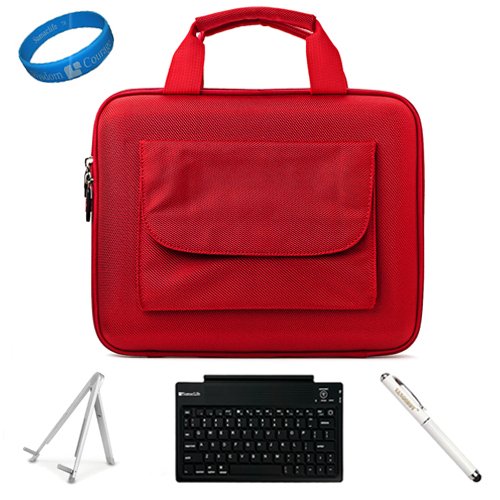 The Detailed Description of Nylon Red Durable Cube with Pocket Series Carrying Case with Pocket for Lenovo IdeaPad Tablet K1 10.1-inch Display Wireless Computer Tablet + White - Executive Stylus Pen with Laser Pointer and LED Light + Universal Silver Tablet Stand + SumacLife Wireless Bluetooth Keyboard + SumacLife TM Wisdom*Courage WristbandFeatures